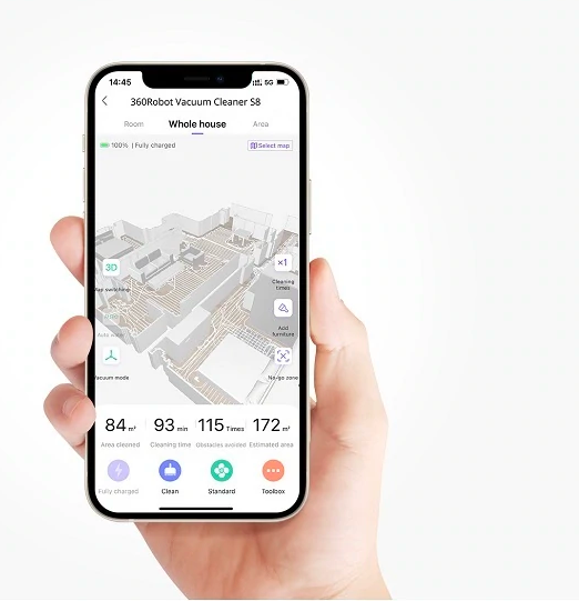 Real-time display of the use status of consumables. Do-not-disturb mode. Remote control mode. Real-time checking of cleaning paths