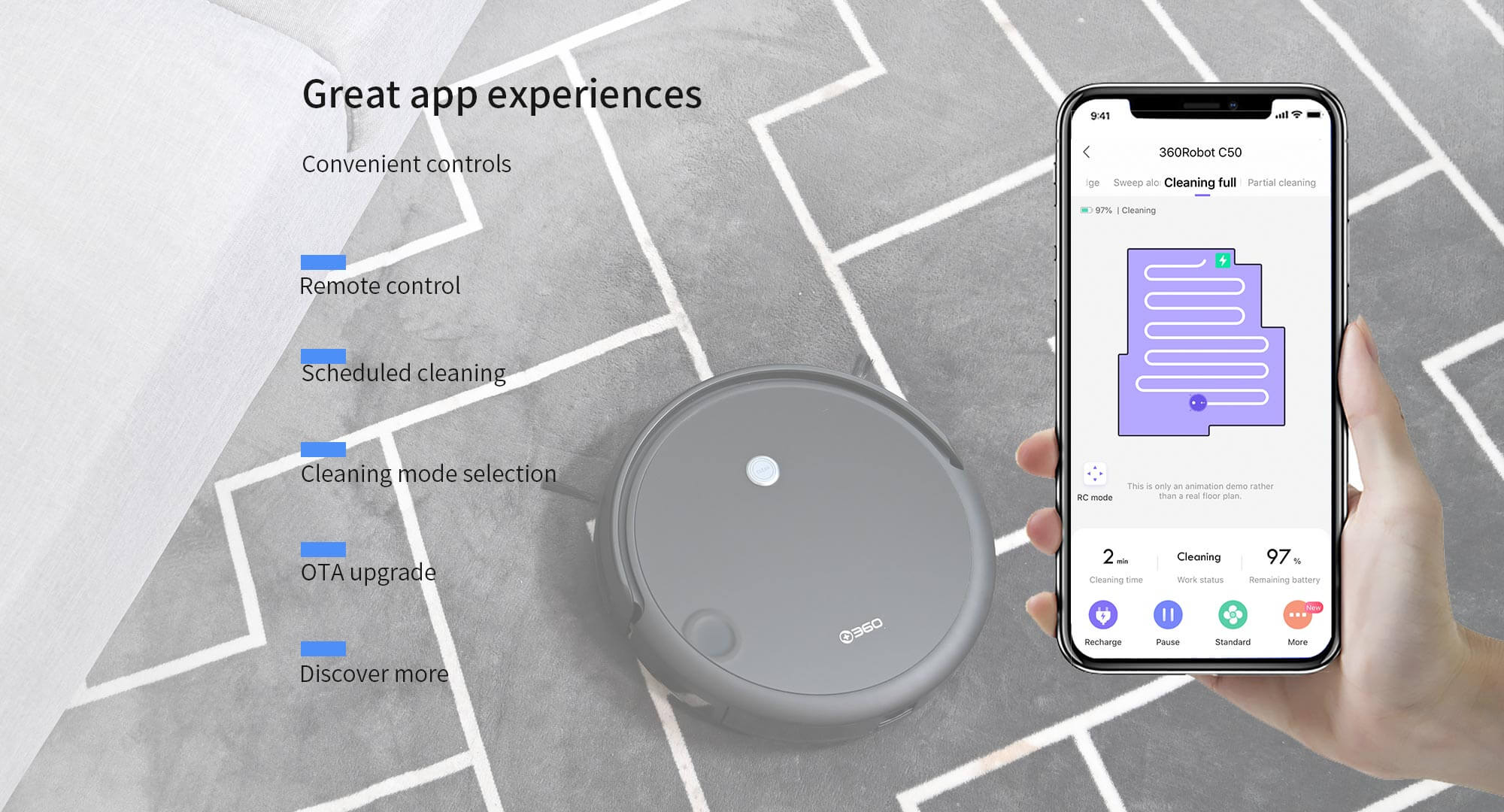 Keep your floors cleaner than ever before with the C50 Robot Vac from 360. A vacuum and a mop all in one, this powerful cleaning buddy allows you to switch modes to suit your needs, with a 360 smart navigation system for highly efficient cleaning, reduced overlap and improved coverage. Plus, with a smart IR remote control and app compatibility for total ease of use, the C50 is ideal for cleaning large homes with ease.