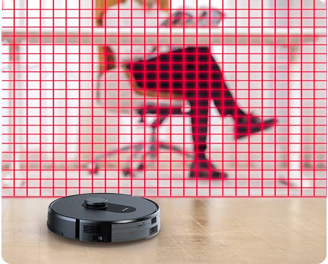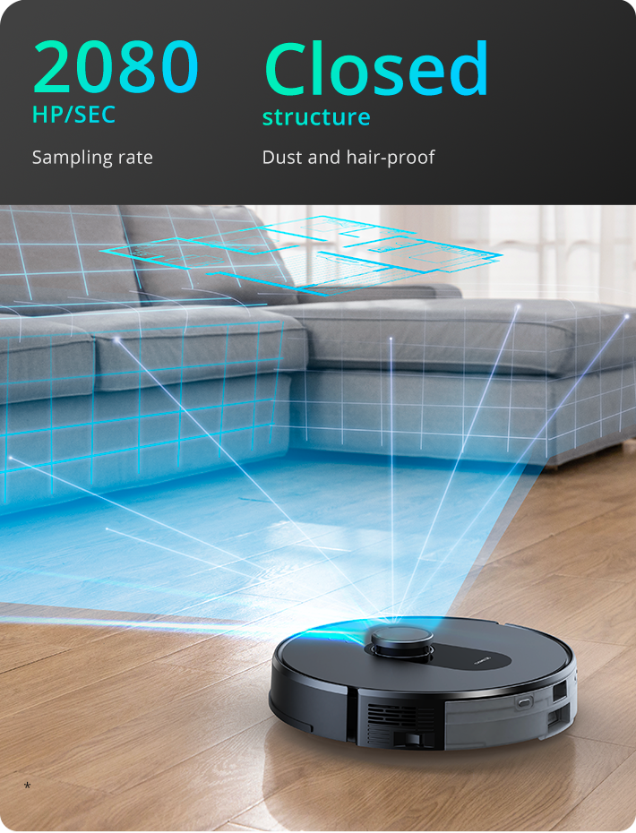 LDS LiDAR can locate and scan the home environment with millimetre-scale accuracy and a speed of 2080 points/s*, so as to accurately create a floor plan and avoid obstacles