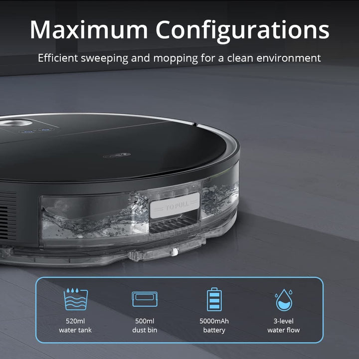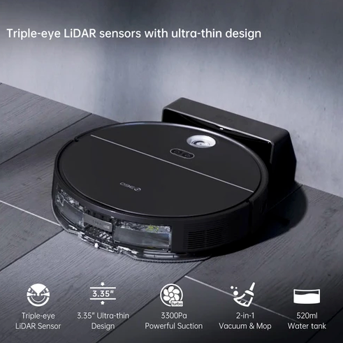Trinocular built-in LiDARs provide navigation for three-dimensional obstacle avoidance 3300Pa superior suction丨520ml electronic water tank 丨500ml dust 丨 5000 mAh high-capacity battery